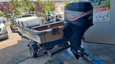 vendo barca dell Quay dori 17 lunghezza scafo 4.7 metri circa, ottima base per bass boat in quanto scafo trimarano completa di cuscini anteriori e posteriori , panca portaoggetti anch'essa con cuscino , corrimano originale ,pompa di sentina. panche in legno riverniciate recentemente possibilità di fornire a parte motore 2 tempi 25 CV con documenti e carrello 750 kg omologato vendo per inutilizzo
