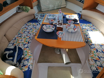 Bagno, cucina interna più fornello mobile, ampia dimette trasformabile in ampia camera matrimoniale, pozzetto ampio, 3 tavoli in legno (uno tondo, 2 rettangolari) ecoscandaglio, 2 batterie nautiche e caricabatterie elettronico, scaletta, passerella, riserva idrica, serbatoio carburante 70 + 40lt, completa di tutti gli accessori per una ottima vivibilità di bordo (bicchieri e piatti in melamina, posate, stoviglie, bombola gas, tazzine caffè etc etc)