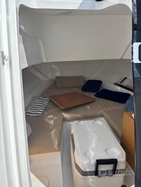 DESCRIZIONE : Idea Marine 58 wa : in vetroresina, varo a 6/2022 "Cabinato senza patente" Accessori di base : - scafo grigio con 5 gavoni (ancora+cabina+sedile guida+centro barca+posteriore) - luce in cabina - cuscineria in cabina per letto 2 posti, 2 oblo apribile in cabina - mobili + mensole in rovere + vano per ghiacciaia - sedile guida con gavone - panca di poppa con poggiaschiena, apribile a gavone - parabrezza plexi - serie completa di corrimano in inox - cuscineria prendisole di prua - cuscineria pozzetto - timoneria meccanica - luci di navigazione - scaletta risalita in inox - pompa di sentina - volante deluxe - scorrisagola, ecoscandaglio, dotazioni di sicurezza nuove. Tendalino di poppa con struttura in acciaio INOX.