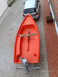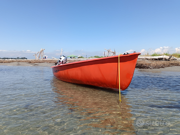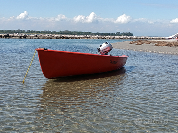 Barca favolosa, spazi ampi e ottima stabilità in soli 420 cm. Scafo autosvuotante con 2 ombrinali. Ideale per uscite in famiglia o con gli amici, per prendere il sole (incluse cuscinerie nuove in pelle), per pescare o semplicemente per passare dei momenti di relax in mare, al lago o in laguna... Ideale anche come barca da pesca grazie agli spazi ampi. Barca nata come deriva polivalente, si trasporta facilmente ed ovunque con la vostra auto, con il vostro camper o semplicemente a mano grazie al suo peso limitato di soli 90kg. Incluso albero e boma volendo trasformarla in deriva a vela. Lunghezza fuori tutto: 4,20 m Larghezza max. :  1,63 m Portata - equipaggio:  kg. 300 - 4/5 persone Inclusi salvagenti, parabordi, ancora e cime PUNTI DI FORZA - LEGGERISSIMA, si sposta da soli senza alcuna difficoltà - COMODA può essere usata al mare, in laguna, al lago o dove volete. Si mette in acqua senza difficoltà - VERSATILE può essere usata come barca a motore o a remi, ma avendo albero e boma in alluminio si può usare anche a vela... Ha un potenziale ampio prendisole a prua che diventa un letto per 2 persone con panche laterali. MOTORIZZABILE CON MOTORE ELETTRICO O ENDOTERMICO SE INTERESSATI: Motore Honda 6hp 4 tempi BF6AH (ANNO 2023) con pochissime ore, girante nuova, olio piede nuovo (+ 900 euro) SE INTERESSATI: CARRELLO Sacar 450 kg REVISIONATO fino al 2027 come nuovo con verricello manuale nuovo (+ 1.100 euro) Barca 1280 Euro Barca + motore 1980 Euro Barca + motore + carrello 2980 Euro