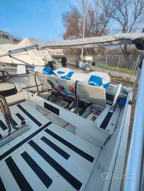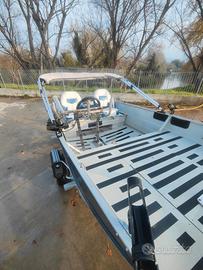 Barca Open in alluminio stile Bass-boat in condizioni pari la nuovo, impianto elettrico con stacca batterie, timoneria completa, pompa di sentina automatica, due serbatoi da 30 LT con filtro decantatore e predisposizione per motore elettrico di prua e di poppa. La struttura del piano è tutta in alluminio salvo la panca posteriore in legno. Tendalino 3 archi e 6 porta canne regolabili. Tutto rifatto a nuovo ad inizio estate 2023. Carrello Ellebi 600kg utili revisionato a febbraio 2026 con targa nuova. Non vendo solo carrello ma eventualmente solo barca. Visibile zona Arca Pescara. Possibilità di trasporto. Saluti, M.B.