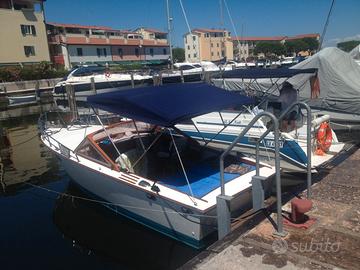 Vendo barca tipologia motoscafo di metri 7 circa in compensato marino il tutto vetroresinato con motore AIFO 160cv, piede volvo DP290, idroguida, tendalino camper su misura, salpa ancora, sotto prua due cuccette, a poppa ampio prendisole, spiaggetta, paglioli in tek e doccetta.