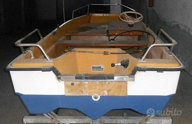 Vendo per inutilizzo barca in vetroresina, rimessata in box, completa di remi lunga 3,80mt e larga 1,45mt con timoneria meccanica completa di volante con motore Mercury 25 CV 2 Tempi con regolare libretto. No carrello portabarca. Ritiro in loco.