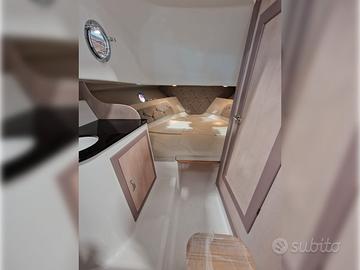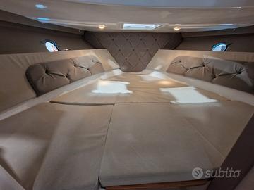 La cabina è dotata di tutto ma proprio tutto dal bagno separato completo di doccia alla moderna cucina con frigo e alla presenza di un terzo letto cosa introvabile su imbarcazioni della sua categoria lasciando comunque ampi spazi di passaggio e un'altezza generosa.