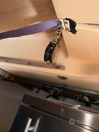 Con vela, stecche, bozzelli, strozzascotte, set scotte completo, lama deriva perfetta, lama timone perfetta, barra timone di legno con prolunga in alluminio.