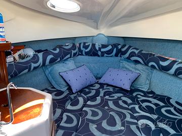 Ancora in acciaio 2022, salpa ancora elettrico, paiolato pozzetto in sughero naturale, cabina con 4 posti letto (2 a prua + 2 sotto il pozzetto), frigorifero 2023, cucina con lavello e fornello, bagno in locale separato con wc elettrico con serbatoio acque nere e maceratore con scarico a mare, ecoscandaglio Garmin 2023, presa 220V interna e presa esterna per banchina, 2 batterie 2023, caricabatterie 2022, staccabatteria/selettore 2025, bimini top 2021, coperture per campeggio nautico 2024, telo copertura pozzetto, telo copertura integrale invernale, cuscineria pozzetto, 2 prendisole prua e divano plancetta poppa.