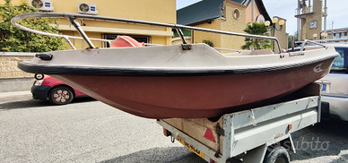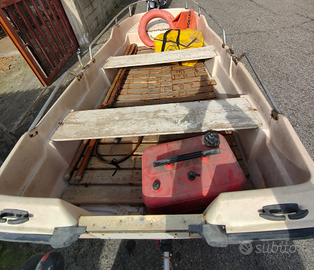 Barca lord junior 3 mt x 1,40 mt corredata di: motore johnson 6 CV, serbatoio, remi, pedane antiscivolo fatte su misura del valore di ?250, borsone completo e accessori salvataggio. Motore fermo da un po' di tempo ma funzionante (probabilmente da revisionare).