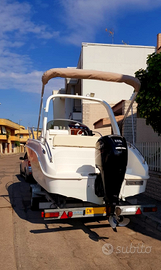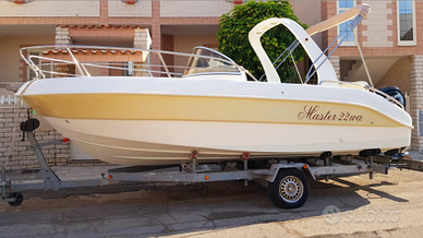 Barca Master 22 Walkaround scafo 6,75 completa di tutta la documentazione di proprietà ed omologazione categoria B per 8 persone, e motorizzazione fino a 200cv, grazie alla struttura forte, super accessoriata con motore Mercury 115 CT Maggio 2018, con idroguida e 145 ore di moto, e tagliandato sempre Mercury, tra cui l'ultimo appena effettuato. Tendalino in acciaio piú copertura completa, accessorii roll bar in vetroresina su misura, faretti per illuminazione esterna, illuminazione interna a striscia led impermeabile, salpa ancora elettrico, doppia batteria, stereo bluetooth, casse bose 300w nuove, ecoscandaglio, serbatoio acqua dolce per doccia, cuscineria interna ed esterna, oblò centrale per una maggiore illuminazione e aereazione della cabina, bitte in acciaio inox a scomparsa, scaletta a scomparsa. Modello con prendisole come mano marine, italmar, sessa, saver e altre wa. Vero affare.