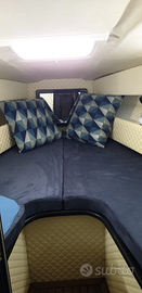 Tavolino idraulico che abbassato diventa parte centrale del divanetto diventando tutto prendisole, internamente wc con lavandino e doccia, frigo, lavandino inox, tv, tutte le luci a led.