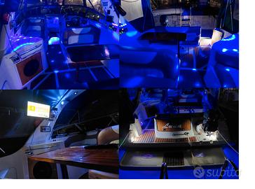 9) Illuminazione a LED bianca e blu su tutto il ponte, nelle cabine, nel motore, nel vano catena, in tutti gli spazi per cime, cavi, scarpe, guardaroba e in mare 4 fari RGB che creano anche uno spettacolo di luci in mare collegato alla musica.