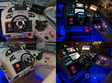11) Illuminazione ambientale a LED da 120W a prua, 2 da 55W sui lati e 110W a poppa garantiscono attracchi e navigazioni notturne in sicurezza. 12) Router WIFI con scheda SIM + telecamera di sorveglianza a 360° + temperatura esterna + audio per poter comunicare con la barca anche tramite smartphone,