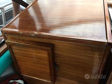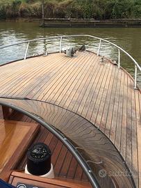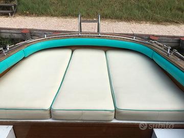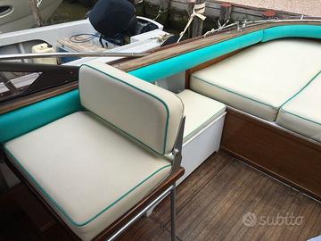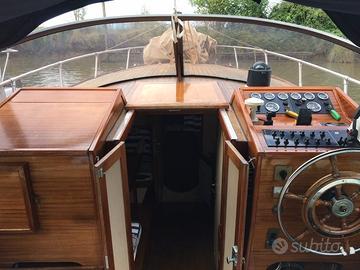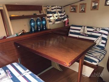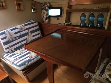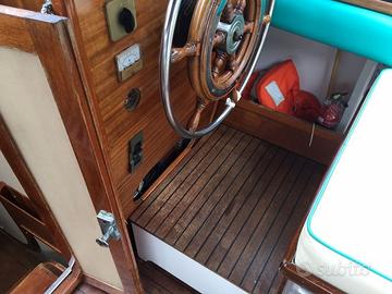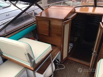 ACCESSORI: Bussola - Indicatori angolo flaps - Autoclave - Verricello ancora elettrico - Flaps - Scaletta bagno - Camminamenti laterali in teak - Pozzetto in teak - Plancetta in teak - Prendisole a poppa con materassini - Capotte completa chiusura camper ad archetti - Copri barca completo - Tendalino parasole con n° 4 tubi. Cucina: piano cottura a gas n° 2 fuochi - Lavello con vasca - Frigorifero (45L) Lavori: nel 2000 portata a zero la carena - Rifatto il teak - Rifatto il plexiglass del parabrezza - Sbarcati i motori per revisione completa.