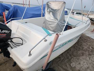Vendo Barca open 5 metri senza patente, con motore 40 cv. Ottimo stato. Completa di tutto, cuscineria originale. Due serbatoi da 30L cadauno. Ecoscandaglio gps Garmin. Ancora nuova. Parabordi, dotazioni di bordo. Pronta per navigare. Prezzo leggermente trattabile.