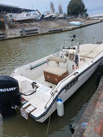 Vendo barca open 20piedi Long boat comprensiva di motore Mercury efi elpt 40cv del 2012 con circa 1100 ore. La barca, pur essendo non autosvuotante, non ha mai creato problemi di alcun tipo anche grazie al sistema di pompe di sentina per espulsione acqua piovana. Due batterie da 90 ah con sistema elettrico sdoppiato. Stabile e spaziosa è perfetta per la pesca. Dotata di tendalino, 6 portacanne da riposo + 3 da pesca, 2 batterie da 90 ah con rispettive scatole + faretto, ecc. Serbatoio da 55 lt. Gavone di prua, di poppa, e a centro console, stivetta per l'ancora, più sportello laterale. Motore 40cv Mercury perfetto ( tagliandato ogni anno ) con consumi veramente irrisori che riesce a tenere velocità anche sotto al nodo e mezzo ( perfetto per la traina ) senza mai impallarsi ed eventualmente motore suzuki 6cv quattro tempi da concordare. Vendo per passaggio a categoria superiore. Prezzo trattabile