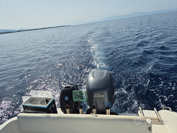 Vendo barca e motore Yamaha 200 cv 4 tempi con poco piu di 1000 ore in ottime condizioni, sempre tagliandato con ricambi originali ,barca comoda sia per la famiglia che soprattutto per la pesca. Scafo molto performante ,velocità massima 35 nodi ,ampi vagoni a prua ,murate alte e larghezza 2 metri e 50. Monta i seguenti accessori ,hard top inox con telo allungabile per tutta la prua, doppia seduta inox originale, faro a LED, 12 portacanne da riposo piu 2 janco best top di gamma, ecoscandaglio Garmin 923 xsv con trasduttore gt51 tm , serbatoio carburante 240 lt, doppia batteria sparco 100 ah, idroguida , easy trolley, sterzo cromato a 3 raggi , bussola , tavolo con portabevande,tromba, luci via, cabina sotto console con wc elettrico nuovo,luci cabina , ancora 6 kg con 50 m di catena , doppia vasca del vivo con presa mare jabsco, tuna tubes WF ,pompa completa per lavaggio ponte con presa a mare e autoclave jabsco top di gamma , doccia acqua dolce con serbatoio 80 lt, doppia pompa di sentina prua e poppa ,scaletta inox , impianto con doppio pannello solare con 2 prese per mulinelli elettrici, pannello con presa accendisigari porta usb e aux , stereo boss marine con casse garmin fusion 100 watt , cuscineria completamente rifatta nuova , motore ausiliario hidea 20 cv con ancora 1 anno di garanzia, accoppiato al motore principale con barra di accoppiamento !