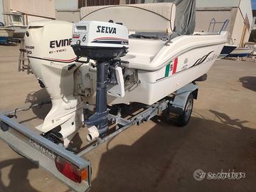 motore Evinrude E-Tek 90 Cv 2007 sempre in rimessaggio carena intatta mai anti vegevetativa con carrello Pedretti con gomme e cerchi nuovi pronto da revisionare portata 1300 Kg fino a 6 metri ,motore 4 tempi Selva sea bas 6 Cv mai usato, ecoscandaglio, porta-motorino basculante, rifatta selleria, elica di scorta, set di candele nuove ancora, ecc.. Trattabile