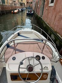 Barca autosvuotante completa di: tiemo ad archetti con cerniere per dividerlo a metà, luci di via (verde e rosso messe anche a prua per utilizzarla con il tiemo attaccato), luci a led interne, cuscineria completa, scaletta di risalita, moquette, pompa di sentina nel gavone di poppa, serbatoio carburante fisso con indicatore del livello, doccetta con serbatoio acqua dolce 40L, amplificatore e casse marine.