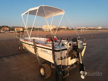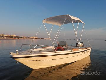 LaOpen Conero Delfino è una storica imbarcazione del cantiere marchigianoConero, nota per la sua robustezza e stabilità in mare nonostante le dimensioni contenute. È un classico della nautica da diporto italiana, ideale per uscite giornaliere, pesca e piccoli spostamenti sottocosta. Caratteristiche Tecniche e Design Questa barca è progettata con una carena a "V" che garantisce un'ottima tenuta, rendendola una delle imbarcazioni più sicure della sua categoria. Tipologia: Barca a motore "Open" (senza cabina), autosvuotante. Misure: Lunghezza circa4,80 metri con una larghezza di circa1,85 Portata Persone: omologata per5 persone Motorizzazione: 25 CV Allestimento e Comfort L'organizzazione degli spazi è pensata per massimizzare la vivibilità a bordo: Prendisole: Ampio piano prendisole a prua, completato da cuscineria rimovibile. Gavoni: Presenta ampi spazi di stivaggio sotto le sedute di prua e di poppa per riporre dotazioni di sicurezza e attrezzatura da pesca. Console di Guida: Posizionata lateralmente, dotata di volante e strumentazione di navigazione. Accessori : equipaggiata contendalino parasole, scaletta di risalita in acciaio inox, pompa di sentina e luci di via. Punti di Forza Materiali: Realizzata in vetroresina di alto spessore, che la rende estremamente duratura nel tempo e resistente agli urti. Stabilità: Grazie alla forma della carena, mantiene una posizione stabile anche con carichi asimmetrici o in presenza di mare leggermente formato. COMPRESO CARRELLO ALAGGIO Idraulico con motrice su ruota anteriore