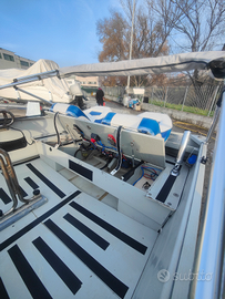 Barca Open Marine 450U in alluminio stile Bass-boat in condizioni pari la nuovo, impianto elettrico con stacca batterie, timoneria completa, pompa di sentina, due serbatoi da 30 LT con filtro decantatore e predisposizione per motore elettrico di prua e di poppa.