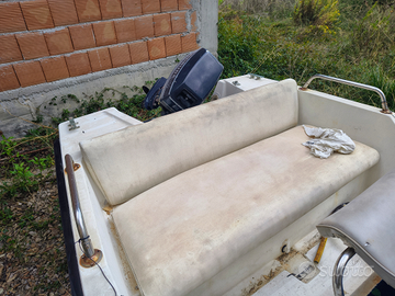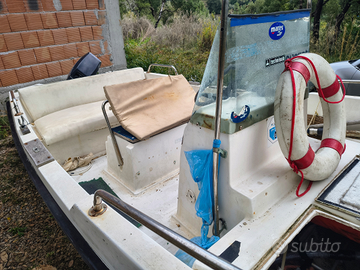 Vendo barca open in vetroresina, lunghezza circa 4,6 metri, con motore fuoribordo Evinrude 6 cavalli 2 tempi e serbatoio da 12 litri.