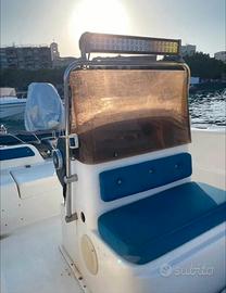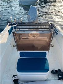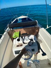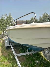 Vendo Open 5 mt colore bianco, fondo azzurro, tappezzeria, tendalino, scaletta in acciaio di risalita, pompa di sentina automatica e manuale nuova installazione, autoclave + serbatoio 55 Lt, serbatoio benzina 50 Lt, impianto elettrico nuovo + 2 batterie, 2 casse stereo, presa usb X accessori e ricarica, luci di via, anti vegetativa tondo, ancora, tromba, timone anno 2024, cavi manetta Honda anno 2024, Motore Fb 40 cv 4 tempi, in ottimo stato circa 300 h, consumo bassissimo, tutto il tagliando con girante sostituita, non c'è da fare nulla, la barca è pronta x il mare, conduzione senza patente nautica. Il carrello non è in vendita.