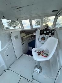 Vendesi barca pilotina di 6 m , cabinata con letto due posti , molto spaziosa , bagno separato con wc lavandino e doccia con serbatoio acqua 50l , motore entro fuoribordo mercury 3000 benzina , motore ausiliario 9 cv Yamaha, doccetta esterna , luci di navigazione notturna , faro supplementare orientabile , dotata di molti gavoni . Entrambi i motori hanno bisogno di revisione e riparazioni .