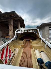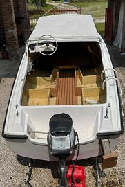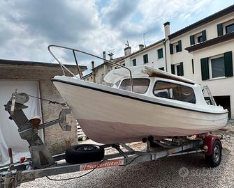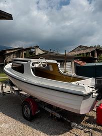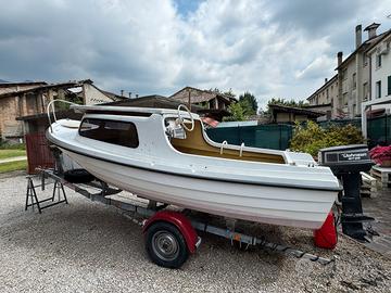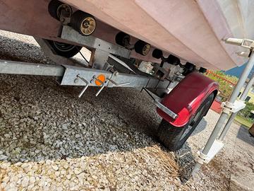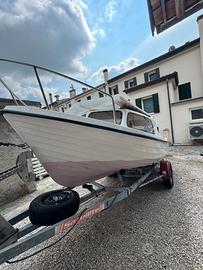 Barca a motore modello pilotina, dotata insieme di carrello rimorchio per il trasporto. Superiormente aggiunta di confortevole piano solarium o relax.
