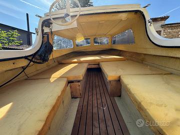 Dotata anche di cuscini da foderare, sia per la seduta che per rendere la cabina un letto unico (come si vede in foto) e creare due cuscini. Presente anche un tavolino ripiegabile.