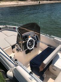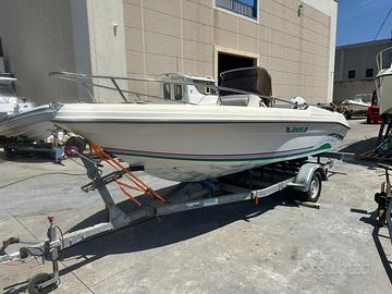 E' una serie limitata della Soverato di Ranieri, è 5.90m ed è omologata per 8 persone.può montare fino a 140cv. Ora monta un selva xs-r 16v con 40cv a libretto ma tolti i diaframmi la barca ha 85cv effettivi. Il motore è il più potente della sua categoria ed è nuovo. Il carrello ha compiuto 2 anni ad agosto. L’impianto elettrico è stato fatto due anni fa ed è stato montato un serbatoio nuovo in materiale composito sotto la pilotina. La barca ha il telo per essere completamente coperta, 2 tendalini di cui uno nuovo e tutte le dotazioni di bordo. Inoltre con la barca fornisco eco scandaglio, radar e gps. Il motore ha 180h di navigazione circa. Vendo solo completa e non accetto nessun tipo di permuta. Il prezzo è molto poco trattabile e comunque esclusivamente dopo visione.