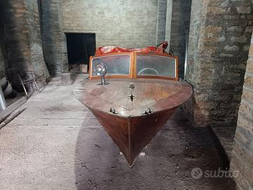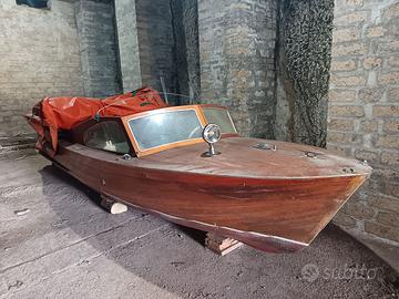 Motoscafo in legno dalla Svizzera all'Italia , completamente restaurato a mano in buone condizioni, situato a Tuscania al coperto in (Provincia di Viterbo, in acqua (ormeggio) durante l'estate sul Lago di Bolsena, sollevato dal lago ogni inverno e riposto a terra vicino all'ormeggio. Una combinazione unica di eleganza vintage in mogano e affidabilità moderna, perfetta per crociere, sci nautico o per godersi il lago. RAVAY OUTBOARD ENGINED SPEEDBOAT in mogano Lunghezza: 5,60m Larghezza: 1,75 M Peso: 260kgs Motore: HONDA 4 Stroke, 40. Numero di immatricolazione: 996 392 752 numero di registrazione VD 2892 Indirizzo: CHANTIER NAVAL ROLAND BALMER-RAVAY RUE DE LAUSANNE 58, 1110 MORGES SWITZERLAND MORGES (vicino il lago di Losanna)