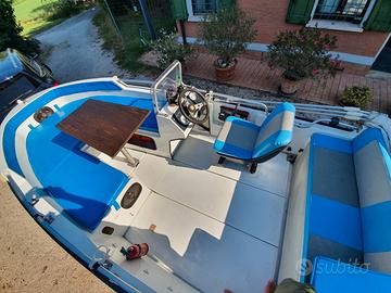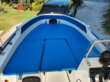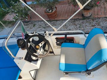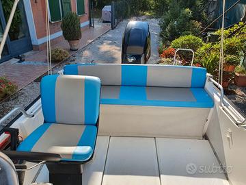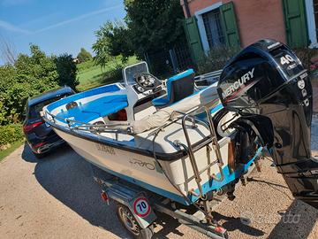 Per passaggio a categoria superiore vendo bellissima barca RIO Open Cross e carrello ELLEBI regolarmente revisionato ed assicurato (gomme nuove 2025) pronto per la strada. Batteria, pompa di sentina elettrica, tendalino con struttura in acciaio inox in buone condizioni, telo chiusura Tessilmare nuovo (2024), ancora, scaletta posteriore in acciaio inox, dotazione di bordo (4 giubbotti di salvataggio, salvagente, mezzo marinaio remo) tavolino di prua, luci di navigazione, bussola, cuscineria completa ed in buono stato, come da foto. Barca tenuta fuori dall'acqua. Motore Mercury F40 ELPT EFI usato pochissimo e solo lago.