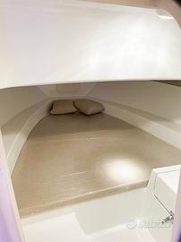 L'imbarcazione dispone di una cabina con 2 posti letto, spaziosa e versatile, con la possibilità di installare un WC chimico. La seduta guida con lavabo è inclusa di serie, mentre il prendisole di prua, ampio e accogliente, offre il massimo del relax. È inoltre predisposta per l'installazione di un verricello elettrico, e si consiglia la timoneria idraulica per una guida più fluida e precisa.