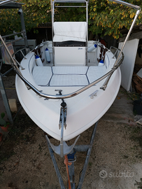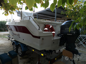Barca di vetro resina Baver Manta 6 metri con T. Top e idroguida tutta in ottime condizioni tutto nuovo con 2 batterie con predisposizione di chiusura con teli dalla prua alla poppa e chiusura a giro nel lato prua. Motore Yamaha 40/70 innezione 16 valvole con piede 100 cavalli con 140 ore di moto. Prezzo non trattabile 12.000?. Dotazione di bordo. Il carrello non compreso non è mio. Purtroppo x motivi di salute