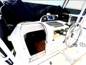 (ci si dorme comodi in tre), bussola, mappe ed ecoscandaglio LOWRANCE Elite-7, ecc. ancora con 50mt di catena, 2 batterie perfette acquistate da meno di 1 anno (ancora in garanzia), doccia esterna, 4 pompe di sentina elettriche, ampia vasca del vivo con n. 2 pompe per riempire e svuotare la vasca, n.1 pompa con presa acqua mare, salpa Ancora Elettrico, prese interne 12v, radio stereo cd, fornello (esterno), cuscineria, telo copri console e strumentazione, telo invernale, serbatoio carburante maggiorato 200 lt. Serbatoio acqua dolce 75 lt. Lavori di Carena e tagliandi ai 2 motori appena eseguiti, nessun lavoro da fare, PRONTA ALLA BOA.