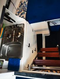 Esternamente, kit cuscineria completamente fatta nuova con tavolo estraibile legno massello e fornelli a scomparsa sotto sella.