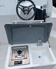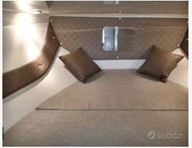 cabina OPEN SPACE con letto a V a prua, WC separato con lavabo, ampio pozzetto di poppa con divano di navigazione corredato di tappezzeria con gavone, tavolo in pozzetto, seduta pilota con lavabo e piano cottura con n* 1 fuoco a gas CAN, ampio prendisole di prua.