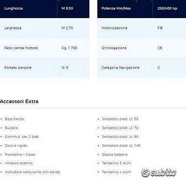 PASSION MARINE e' Official Dealer in Campania del marchio TRIMARCHI , proponaimo una delle barche piu' comode per la famiglia e per godersi giornate di relax in compagnia La Dylet 85 fuoritutto misura circa 9metri comoda e nello stesso tempo molto pratica dai costi di gestione contenuti in quanto potete scegliere di motorizzarla monomotore o con una coppia di motori la versione dylet 85 di casa trimarchi IL Prezzo della barca e' riferito alla singola barca senza motore e con dotazioni standard di serie. Inoltre diamo la possibilita' ai nostri clienti di finanziare l'intero importo della barca e motore . Caratteristiche tecniche: Lunghezza 8.50 m Larghezza 2,70 m Cantiere costruttore: Trimarchi Cantiere nautico Portata persone 9 Potenza min. 250 CV Potenza max: 400 CV Categoria CE: C Posti letto 3 Vano WC separato Serbatoio acqua 45 L Serbatoio carburante 270 L SI GRADISCONO CONTATTI TELEFONICI AL GRAZIE MILLE