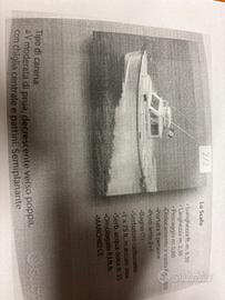 Dotata di motore entrobordo anno 1989 , turbo diesel con turbina modello VM cento mod. HR 494 H 10/1 con 4 cilindri gasolio 70 CV, cilindrata 2776, sempre tagliandato. Velocità massima 22 nodi con bassi consumi. Sostituito da poco filtro completo gasolio e raiser di scarico in acciaio inox.