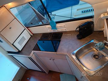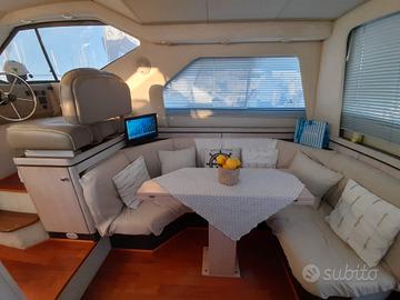 Natante - cabinato - fly Introvabile una barca così in Italia! Portata 10 persone 2 cabine matrimoniali. 1 bagno con box doccia separata. Dinette con 2 divani, tavolo estendibile. Ampio top cucina con piano a induzione nuovo. Plotter Raymarin Elementi 9"HD con trasduttore. Cuscinerie esterne divano fly e prendisole NUOVE. Motori 2 EFB Mercruiser 5.7 LX 260cv. Trasmissione BRAVO2 Riser e collettori NUOVI 2026 Lista lavori motori e refitting esterni 2023.