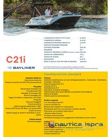 NOTE SUL PREZZO IVA Esclusa DATI PRINCIPALI Cantiere: Bayliner Modello: C 21i Anno Costruzione: 2026 Lunghezza: 6,39 m Condizione: nuovo Tipologia: Cuddy Codice: 863859 Il modello C21i con propulsione entrofuoribordo si distingue per la sua attenzione al comfort e alla funzionalità. Progettato con un approccio "cuddy-first", combina perfettamente una spaziosa cuccetta con generose sedute, ampi spazi di stivaggio e un pratico spazio in coperta. La sua configurazione versatile supporta lunghe crociere e intrattenimento con l'aggiunta di un prendisole di poppa eccezionalmente spazioso, perfetto per prendere il sole e rilassarsi. * Design raffinato: Scafo scolpito con linee pulite, eleganti e sportive, oltre a un elegante parabrezza avvolgente in vetro dal design molto equilibrato e moderno. * Layout spazioso: Ampio ingresso a poppa nel pozzetto e ampie plancette per un imbarco sicuro e facile, e per l'accesso in acqua e in mare. * Versatilità: Area pozzetto multiuso adatta per la navigazione, il relax e la ristorazione. * Massimo stivaggio: Ampia e comoda capacità di stivaggio da prua a poppa, inclusi gavoni a pavimento/portascarpe, gavoni sotto i sedili e vano portaoggetti con serratura. * Design incentrato sulla tecnologia: tecnologia intuitiva a bordo, inclusi caricabatterie induttivi per telefoni, collegamento VesselView e schermo Simrad GO9. * Aumento della capacità del carburante, della lunghezza complessiva e della capacità massima rispetto alla versione fuoribordo C21. (Tradotto dal sito Bayliner con google translate) Le foto sono a titolo informativo, la barca visibile presso la nostra sede è come la foto d'anteprima e con interni color sabbia e pavimento color teak. MOTORI Potenza: 1 x 250 Hp Modello: Mercruiser 4.5 MPI Tipologia: Entro Fuori Bordo Benzina Trasmissione: Entrofuoribordo Anno: 2025 ABITABILITÀ Numero cabine: 1 Numero bagni: 1 Posti letto cabina: 2 Posti letto totali: 2 DOTAZIONI DI SICUREZZA Estin