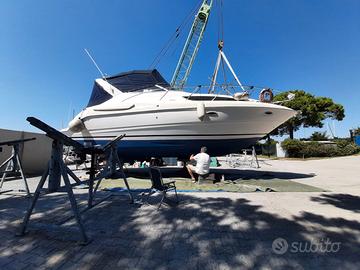 Bayliner 3055 Ciera. Motori Mercruiser 2x 5.7L HP 250. Gps Garmin, radar, ecoscandaglio, VHF. Due televisori lcd, impianto stereo interno ed esterno. Fra il 2025 e il 2026 sono stati effettuati numerosi lavori di manutenzione ordinaria e straordinaria e sostituiti vari accessori: nuova antivegetativa, manutenzione tendalini, fodere sedili, pompa sentina, rifacimento motore destro (il sinistro 5 anni fa), riser nuovi, lucidatura in corso, ecc. Tutto documentabile. Scheda Tecnica: - lunghezza f.t. (LOA): 9,60m; - larghezza (Baglio): 3,35 m - 3,41 m; - pescaggio: 0,53 m - 1,0 m; - serbatoio carburante: 560 litri (benzina); - serbatoio acqua dolce: 150 litri. Abitabilità: - due camerette con 4 posti letto interni e 2 esterni (cabina matrimoniale, camera singola e dinette convertibile); - bagno: Locale separato con WC, lavandino e doccia; - cucina: fornello, microonde, frigorifero e lavello, divano con tavolo; - pozzetto: divano a U con tavolo. In ragione dello stato e della manutenzione, introvabile a questo prezzo. Visita senza impegno. Prezzo lievemente trattabile, primo contatto via subito. Per favore, ASTENERSI perditempo e sognatori, solo gente seriamente interessata. Grazie. Andrea