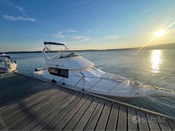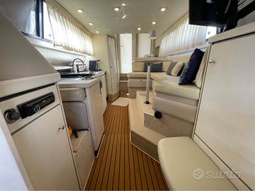 ESTERNAMENTE si compone di un ampio pozzetto con accesso alla sala macchine e a 2 ulteriori gavoni molto spaziosi passaggio con sportello al giardinetto. Flybridge con strumentazione analogica e digitale, dotato di comodo sedile di guida centrale e divano con schienale ad L sulla sinistra. Comodo passaggio a prua in cui troviamo prendisole e salpaancora elettrico dotato di doppi comandi.