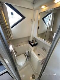 con tavolo trasformabile in un ulteriore letto da 120 cm di larghezza e ulteriore letto sotto la dinette di 200x120 cm. Smart TVcon braccio orientabile, antenna Glomex nuova. Ampia cucina dotata di lavello con rubinetterie nuove 2 fuochi ad alcol denaturato e 2 fuochi a induzione elettromagnetica, forno microonde e frigo 12/220 v, postazione di guida interna con strumentazione analogica. A completare l'interno il bagno separato con wc e pompa manuale jabsco e rubinetteria whale sostituita nel 2024. Piccolo box doccia con tendina con vasca di raccolta per le acque grigie.
