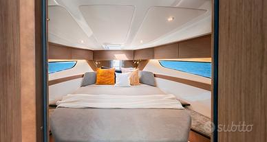 Una grande cabina armatore con letto a isola, alloggiamenti ed un accesso diretto al bagno.