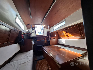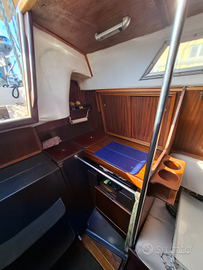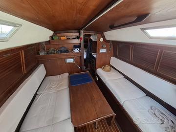 Interni in mogano e teak. Cuccetta armatoriale prua, 2 posti in quadrato + cuccetta di guardia; tavolo centrale abbattibile, tavolo carteggio; cucina a scomparsa, frigorifero; bagno wc marino e lavabo. Legni, cielini e paglioli riverniciati e rigenerati nel 2025.