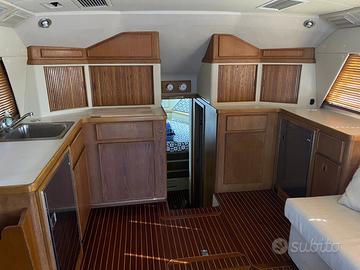 Cabina armatoriale a prua con aria condizionata, cabina ospiti a castello a centro barca, grande bagno con box doccia separato, grande dinette trasformabile con mobili in teak e divano letto, cucina attrezzata con 2 frigoriferi, lavello, forno microonde, tostapane, macchina caffè a cialde, stoviglie e biancheria su misura.
