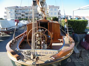 NOTE SUL PREZZO IVA Pagata DATI PRINCIPALI Cantiere: Bianchi e Cecchi Modello: Cutter Anno Costruzione: 1963 Lunghezza: 8,18 m Condizione: usato Stato conservativo: buono Tipologia: Crociera Codice: 846074 GOZZO IN SPLENDIDE CONDIZIONI, DA VERO AMATORE 2022 teak esterno in massello CENNI STORICI "SHUNA" Questo meraviglioso "cutter aurico" è stato costruito artigianalmente dal cantiere navale Bianchi e Cecchi di Cogoleto nell'anno 1963 in legno lamellare a triplo strato sul quale è stato installato un motore entro bordo diesel, di pari data, della ditta LISTER, per una potenza di CV 27 a 2800 giri/m. a 3 cilindri a timoneria idraulica. Vetus. Nasce come "gozzo pontato" con vela "Marconi" (vedi all. 1 certificato di stazza n. 16/77 del 25/03/1977 necessario per l'iscrizione nei RID) probabilmente come barca da pesca dilettantesca visto la passione dei liguri che hanno per certi tipi di pesca. appena restaurata Zavorra interna a piombo 700 kg Zavorra chiglia 2000 kg MOTORI Potenza: 1 x 27 Hp Modello: Lister 3000 cc 700 kg Tipologia: Entro Bordo Diesel Trasmissione: Linea d'assi Anno: 1963 Ore moto: 350 ABITABILITÀ Numero cabine: 1 Numero bagni: 1 Posti letto cabina: 2 Posti letto totali: 2 DATI TECNICI Lunghezza fuori tutto: 8,18 m Larghezza: 2,9 m Dislocamento: 10.810 Kg Persone trasportabili: 6 Velocità a motore: 6 Kn Velocità a vela: 6 Kn Serbatoio carburante: 260 l Serbatoio acqua: 500 l Categoria di navigazione: Entro 12 miglia Impianto elettrico: 12V, 220V STRUMENTAZIONE ELETTRONICA DI NAVIGAZIONE Bussola, Ecoscandaglio (GARMIN FISHFINDER 400 C), GPS (GEONAV 5 TOURING), Radio VHF (alan 78/105). ALLESTIMENTO TECNICO E DI COPERTA Allarme motore, Allarme sentina, Ancora, Autoclave, 4 Batterie (2 OPTIMAX 2019 + 2x180), Caricabatterie, Luci di cortesia, Pompa di sentina automatica, Pompa di sentina manuale, Salpa Ancore Elettrico. DOTAZIONI DOMESTICHE DI BORDO WC marino elettrico. CUCINA E