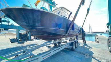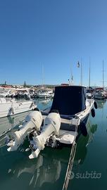 BiMax 730 Genesi??Anno 2004?Lunghezza 7,50 m?Larghezza 2,49 m?Pescaggio 0,50 m?Dislocamento 1678 kg?Serbatoio carburante 200 L?Serbatoio acqua 100 L?Capacità 8 persone ?Velocità Max 36 nodi?Velocità crociera 25 nodi?Motori?coppia di Johnson Bombardier 140hp 4 tempi?Anno 2004 circa 1000 ore di moto perfettamente funzionanti con comando in plancia e trim?Cabina con?2 ampi posti letto con cuscineria. ?Bagno elettrico e tre capienti gavoni con dotazioni di bordo.