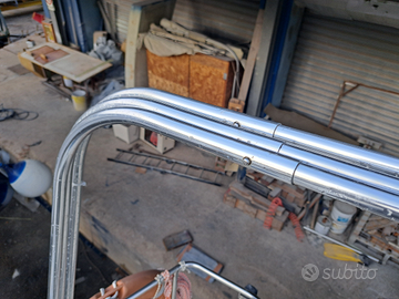 Vendo, per barca 31 piedi, bimini con struttura un alluminio e sacca copribimini, colore azzurro, larghezza 2.60 m, altezza 1.40 m (v. foto e dettagli misure in basso), causa sostituzione con modello nuovo avente struttura in acciaio inox e colore diverso. Il telo si è scucito e, tenendo conto del costo di riparazione, viene dato in omaggio. Prezzo (struttura + sacca) 230 euro.