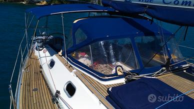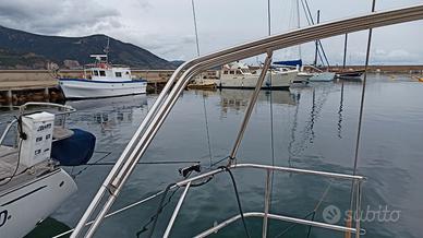 Bimini top completo, struttura in acciaio in ottime condizioni a 3 archi da 28mm di diametro. Tendalino blu largo 350 cm circa, con tessuto in discrete condizioni. Larghezza delle basi di appoggio in coperta 375 cm (ma può essere facilmente adattata stringendo o allargando a mano i pali verticali di fissaggio). Solo contatti telefonici al 3533233495, non rispondo a messaggi.